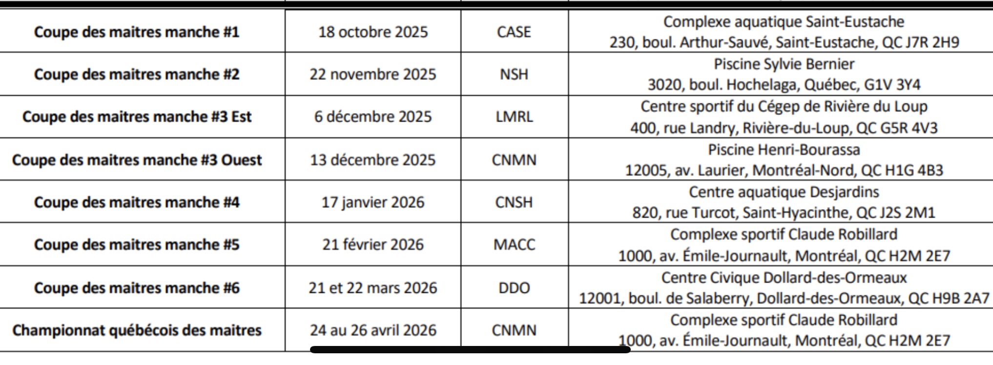 - Les nageurs ont la possibilité de participer à des compétitions, mais n'y sont pas obligés. Le calendrier de compétitions est disponible sous l'onglet Compétition / Calendrier du site internet. Le circuit des maitres nageurs compte 6 manches, un championnat provincial et un championnat canadien. Nous encourageons les maitres du club à y participer.